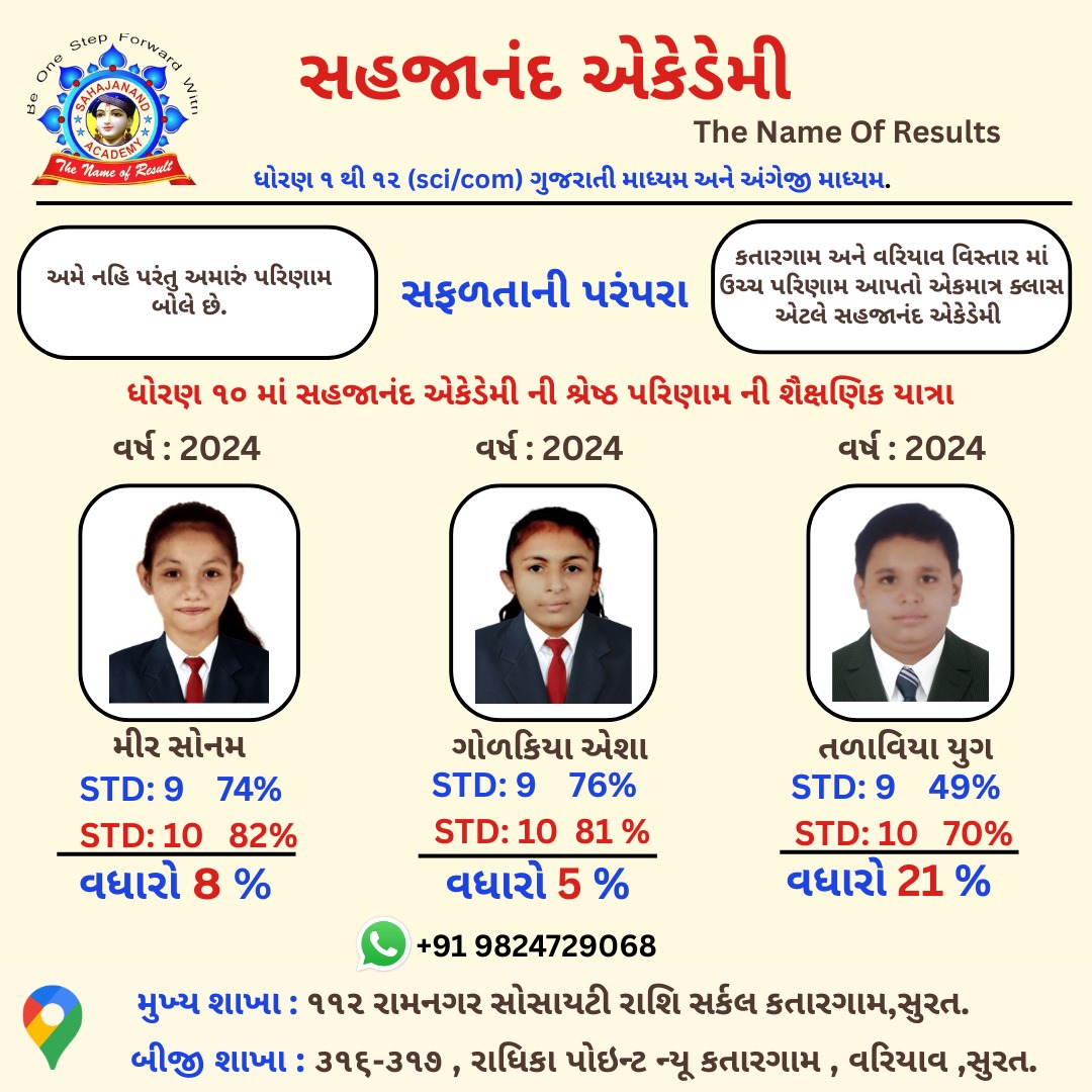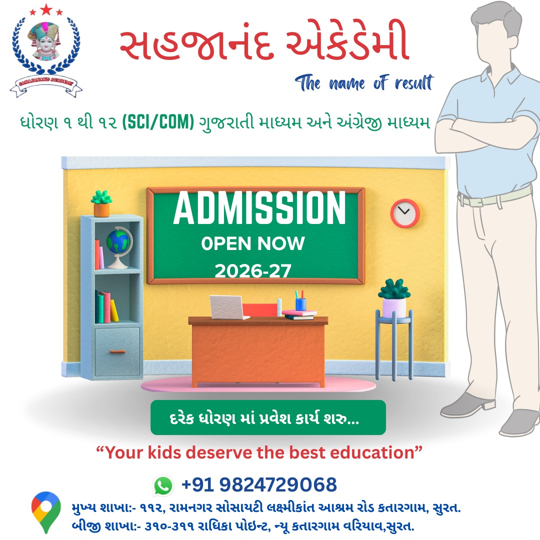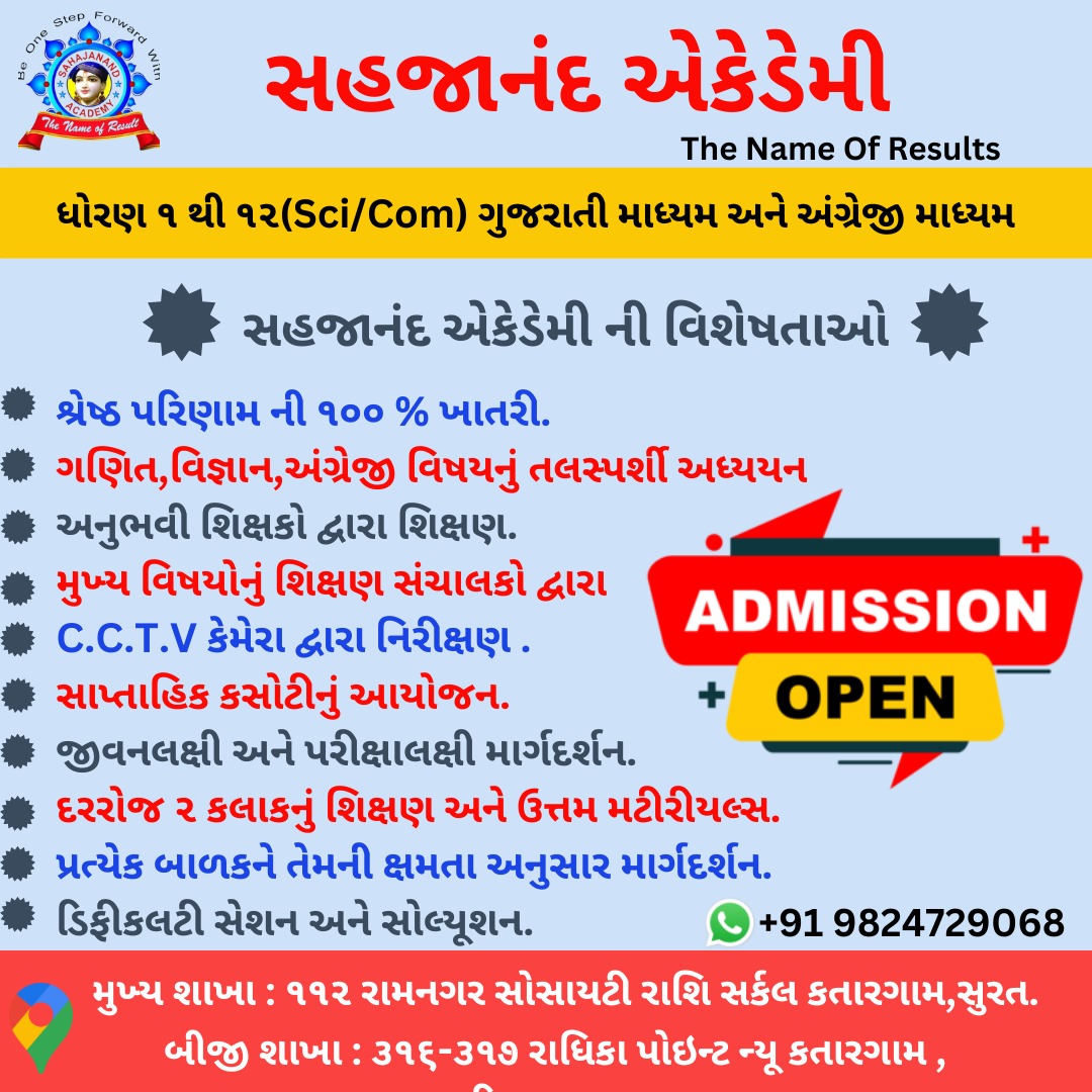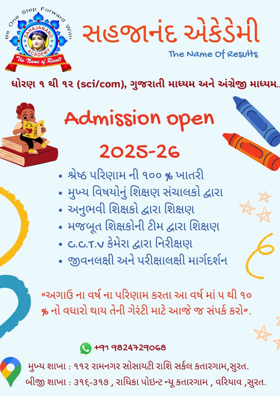 "આવો સહજાનંદ એકેડેમી માં સપના થશે હવે સાકાર..."."અગાઉ ના વર્ષ ના પરિણામ કરતા આ વર્ષ માં ૫ થી ૧૦ % નો વધારો થાય તેની ગેરંટી માટે આજે જ સંપર્ક કરો ..."."Be One Step Forward With..".ધોરણ ૧ થી ૧૨ (SCI/COM), ગુજરાતી માધ્યમ અને અંગ્રેજી માધ્યમ.