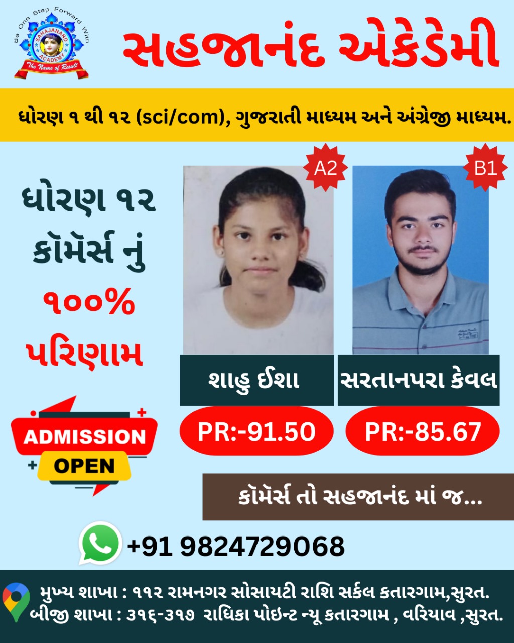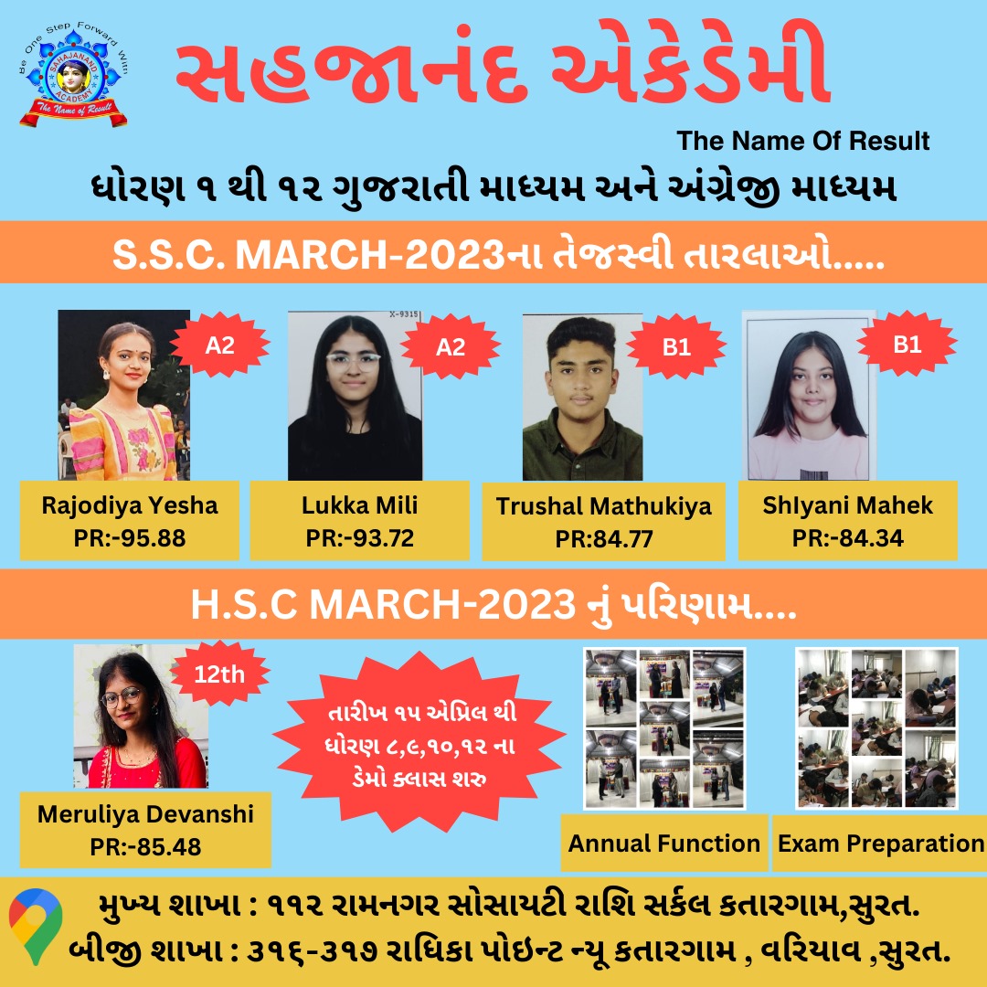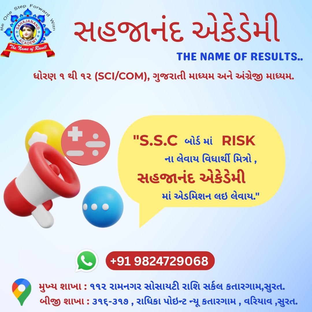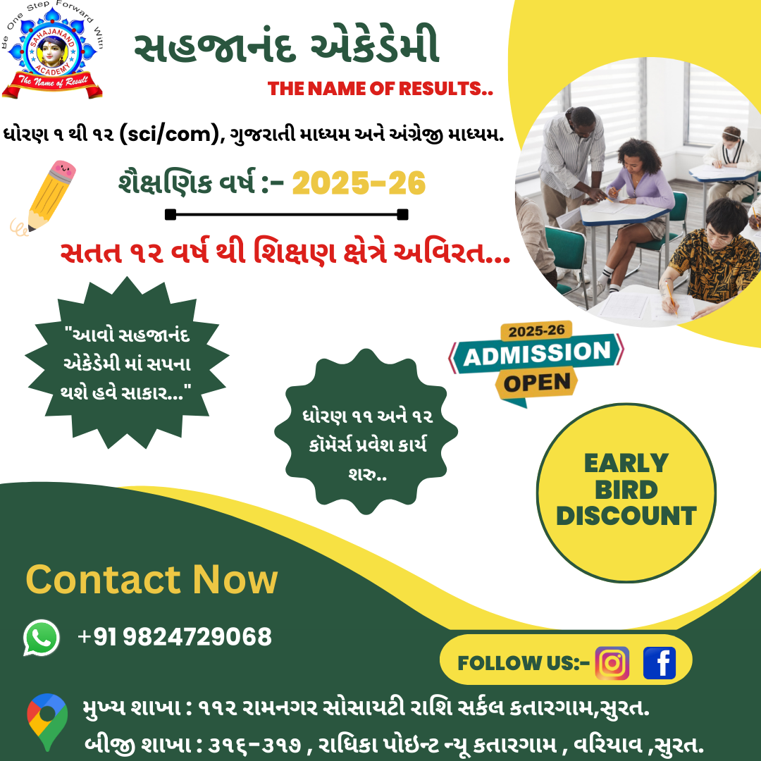 "આવો સહજાનંદ એકેડેમી માં સપના થશે હવે સાકાર..."."અગાઉ ના વર્ષ ના પરિણામ કરતા આ વર્ષ માં ૫ થી ૧૦ % નો વધારો થાય તેની ગેરંટી માટે આજે જ સંપર્ક કરો ..."."Be One Step Forward With..".ધોરણ ૧ થી ૧૨ (SCI/COM), ગુજરાતી માધ્યમ અને અંગ્રેજી માધ્યમ.
