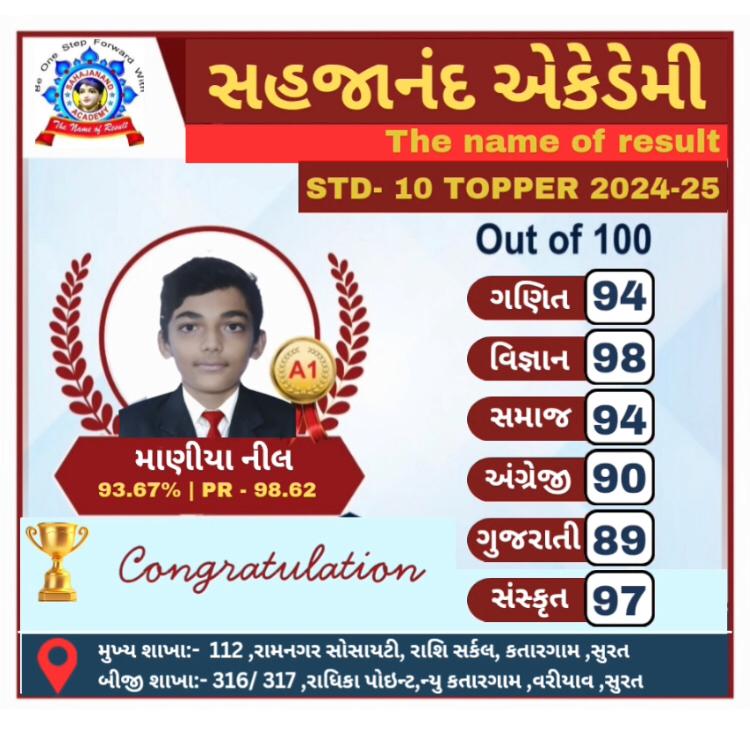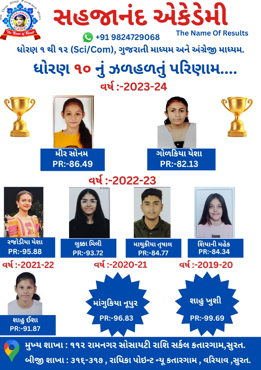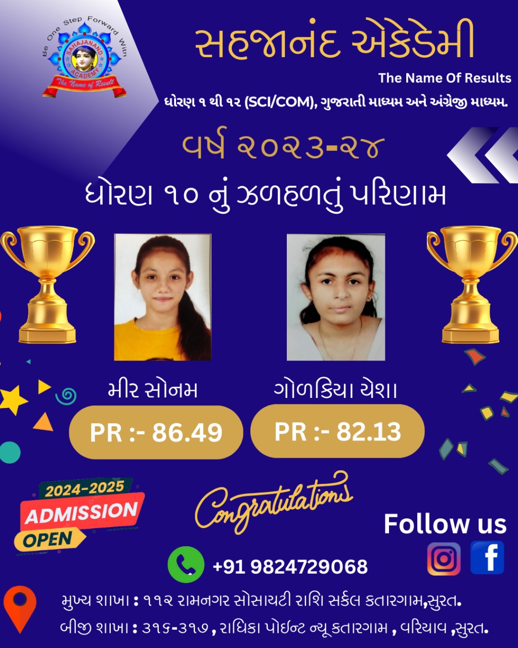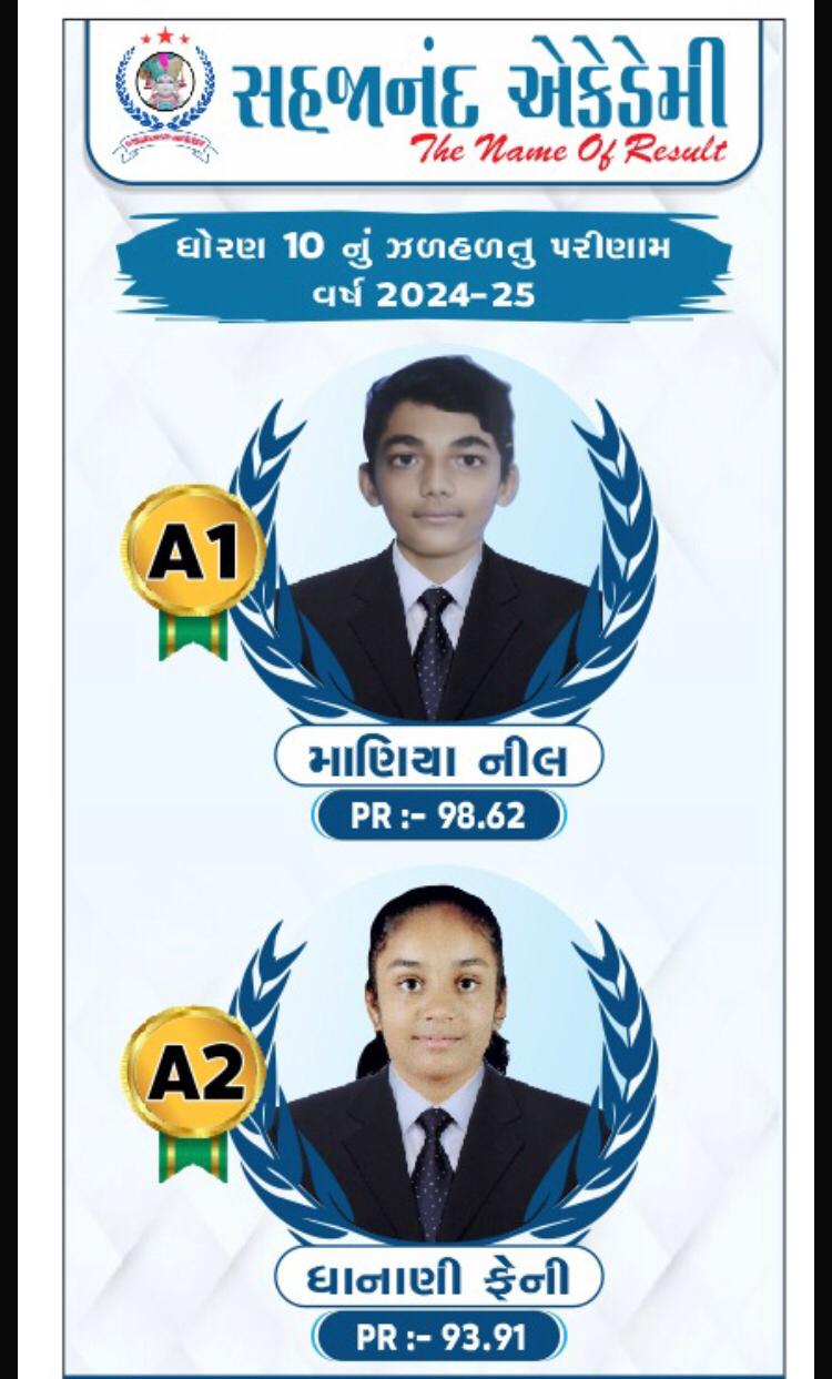 "આવો સહજાનંદ એકેડેમી માં સપના થશે હવે સાકાર..."."અગાઉ ના વર્ષ ના પરિણામ કરતા આ વર્ષ માં ૫ થી ૧૦ % નો વધારો થાય તેની ગેરંટી માટે આજે જ સંપર્ક કરો ..."."Be One Step Forward With..".ધોરણ ૧ થી ૧૨ (SCI/COM), ગુજરાતી માધ્યમ અને અંગ્રેજી માધ્યમ.
